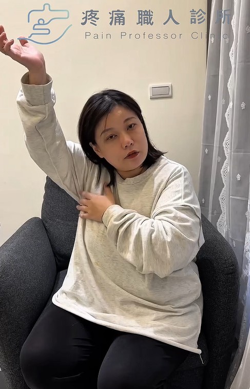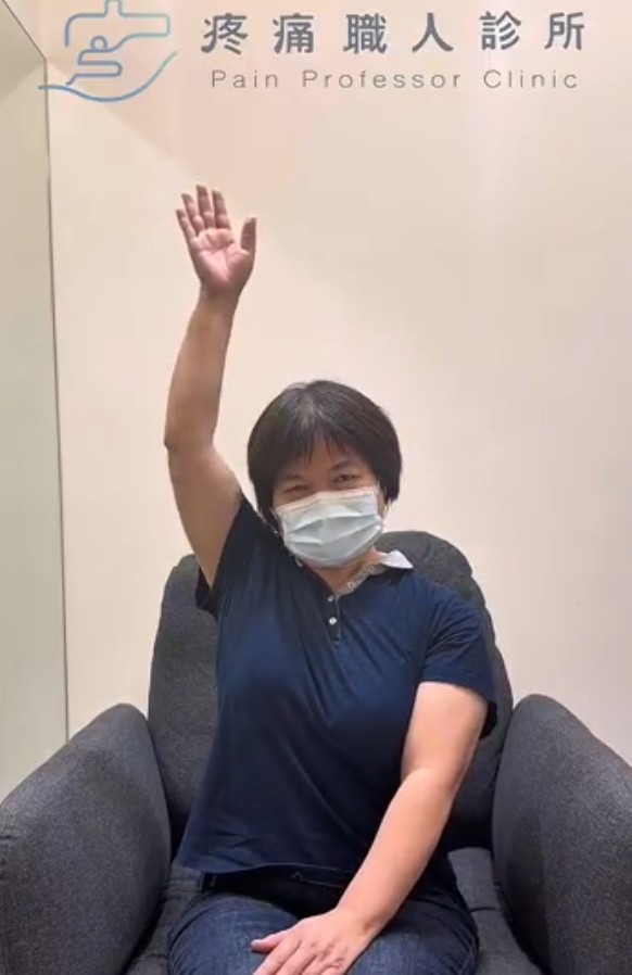 陳小姐:「五十肩治療後基本上手都可以完全抬到耳朵旁邊了; 非常感謝徐醫師,不然我真的不知道還要痛多久」