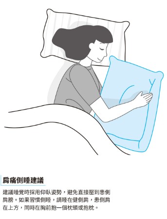 夜間肩痛常讓人難以入眠。建議睡覺時採用仰臥姿勢,避免直接壓到患側肩膀。如果習慣側睡,請睡在健側肩,患側肩在上方,同時在胸前抱一個枕頭或抱枕,讓患側手臂有支撐,減少肩膀懸空下垂的壓力。這樣可以降低夜間肩部牽扯引發的疼痛,提升睡眠品質。