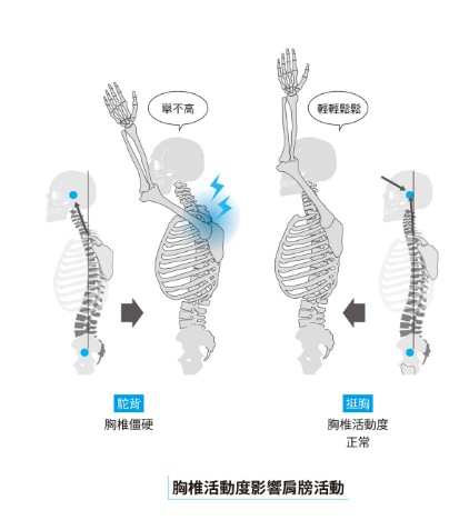 而胸椎過度僵硬(常見於圓肩駝背的人),會限制肩胛骨在胸廓上的移動,使肩膀無法順利抬起。